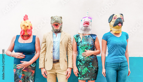 Crazy People Wearing Chicken Unicorn Dog And T Rex Party Mask