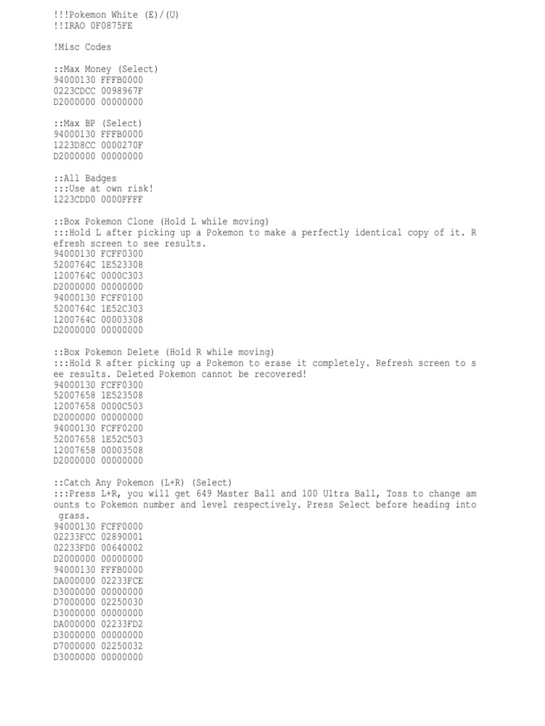 Nintendo Ds Pokemon White Us Eu Jp Action Replay Codes