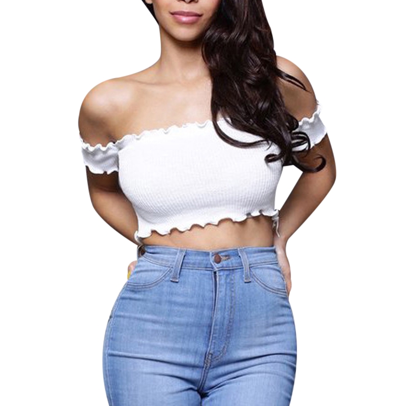 Sexy Off Shoulder Short Sleeve Slim Ruffle Polka Dot Crop Top